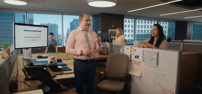 A manager asks, “Who are my rock stars?” and suddenly Gwen Stefani, Billy Idol, and Paul Stanley are forced into a fluorescent-lit office. Paul Stanley presents a financial forecast in full KISS makeup. Gwen Stefani is called “Rachel from HR.” Chaos ensues.